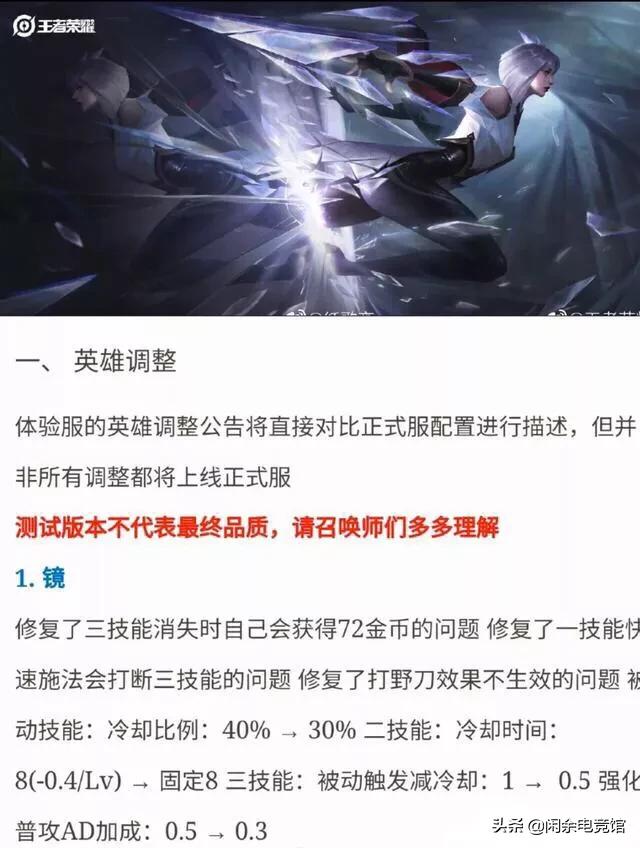 王者荣耀版本最近会进行一波更新,在这更新的内容中有一些皮肤要准备下架了,同时也会上新的一些皮肤给大家限免体验,所以大家可以注意一下这些活动,当然了,还有一个新英雄,东方镜原本定价是在18888金币的,也要改回到13888金币,我觉得这一点改得还不错,因为东方镜这个英雄并没有18888金币的价值,最多也就是13888,所以在体验服进行了改动,那么我们来看看这些更新。