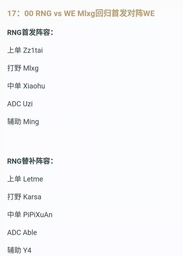 下路组合,在我看来去年的We下路组合是比RNG强的,线上强悍不输,团队输出打的足,去年的大舅子在团战中的输出位置找的很好的,能打出成吨的伤害,以至于出现过好多把4保1和加里奥体系!但是这个春季赛,大舅子的状态很多,经常出现很多莫名其妙的失误,倒是UZI回归之后状态大好,尽管后面这两场比赛大舅子状态有所回暖,但是个人认为依然难挡小狗和小明的组合,we要想赢比赛,在前期中上的节奏带动下,后期团战中大舅子必须承担起Carry的重担!