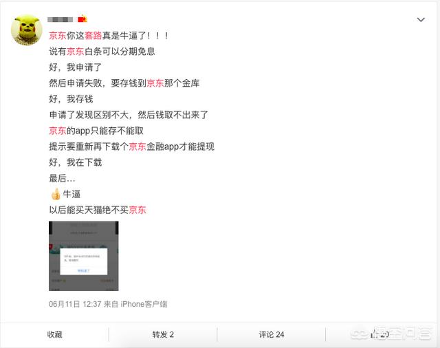 最近刷微博,看到一个网友吐槽京东,说自己用京东白条申请分期免息,却申请失败,说要存钱到京东金库先。但是,存钱后,钱竟然只能存不能取。要取钱智能先下载个京东金融app才能提现,但是最后还是不能取。网友的吐槽如下: