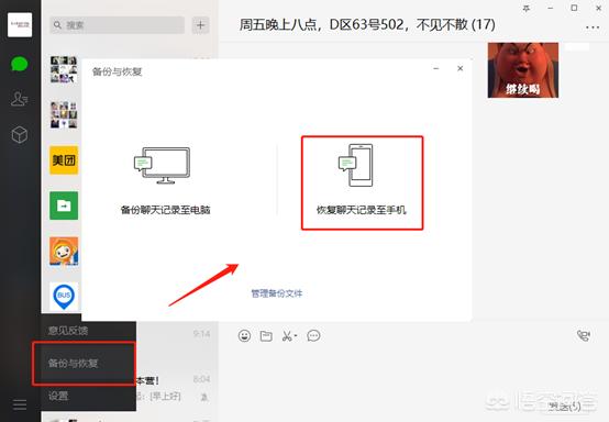 如果使用过电脑端微信聊天的话,里面也是可以将微信聊天记录恢复的,将电脑端微信登录界面的左下角有“三”的标志,点击会有三个选项弹出,然后点击其中的“备份与恢复”随后弹出一个对话框,选择“恢复聊天记录至手机”选择需要恢复的聊天记录进行恢复即可。