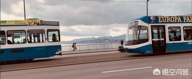 苏黎世街头,有轨电车沿着海边缓缓开过。乌云密布凸显了四季分明的温带海洋性气候。