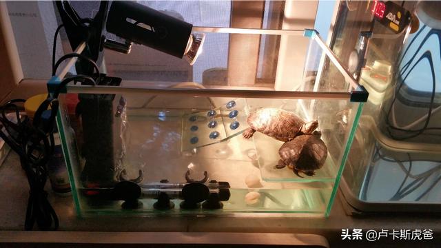 还有一点就是换水,刚换水,巴西龟会贱贱的在里面拉粑粑,过个两天换一次,不然里面就变绿了,还有股臭味,哈哈,时间久了不换水,它们还是容易白眼,红眼。如果你比较懒,那就整个水循环过滤吧,虽然占地方麻烦,但是可以不经常换水了。如果连食物也懒得打理,那就买点龟粮好了,营养高,巴西龟也没得挑的。反正也会吃的。基本上扔进去点龟粮。他们就吃完了。