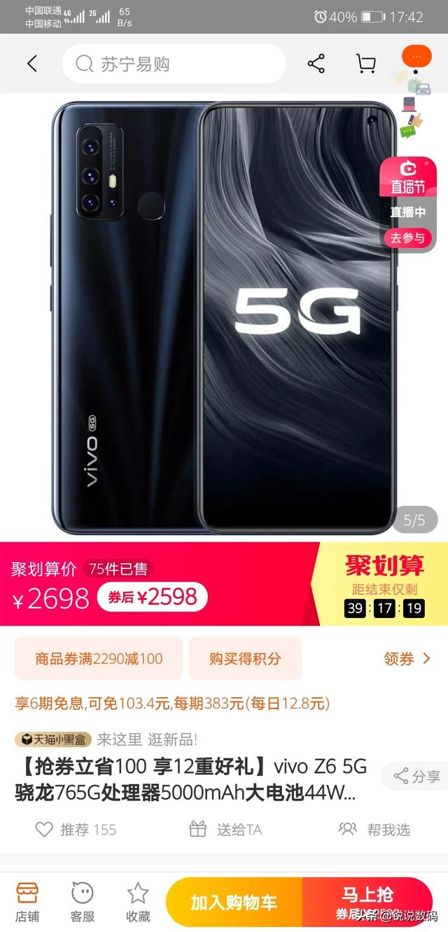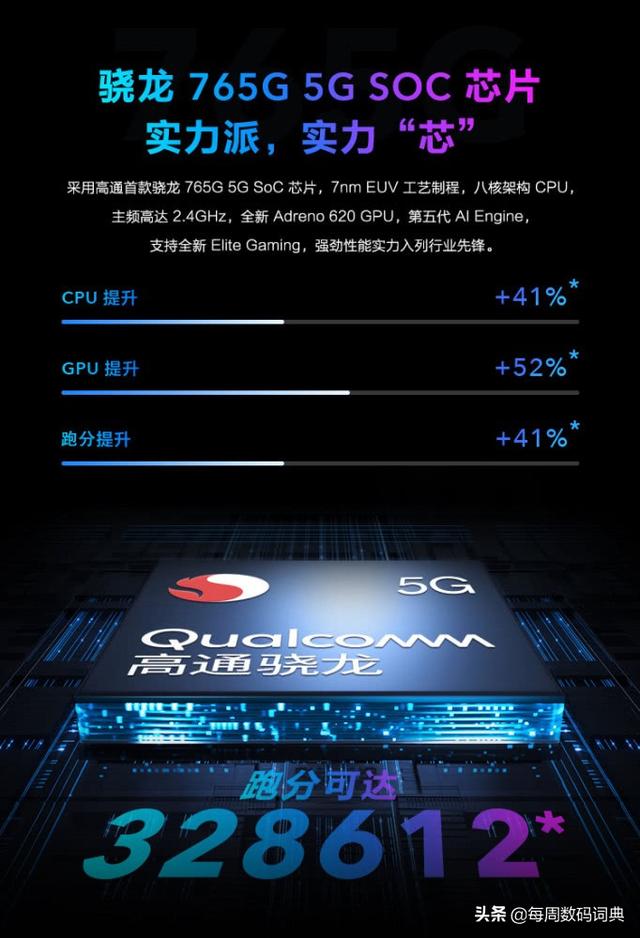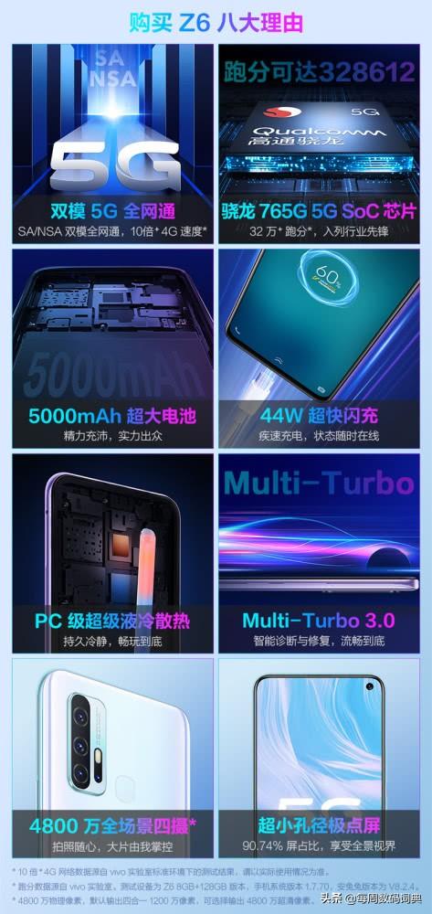 Vivoz6采用的是高通骁龙765G处理器,这款处理器是在骁龙765的基础上往游戏方面升级的处理器,可以说这是一款中端游戏处理器。他的跑分32万多,主频高达2.4GHz,所以这款手机玩王者,吃鸡这种游戏是毫无压力的。