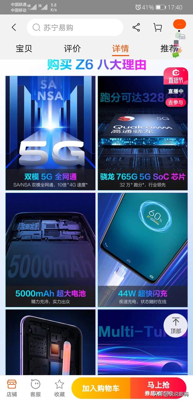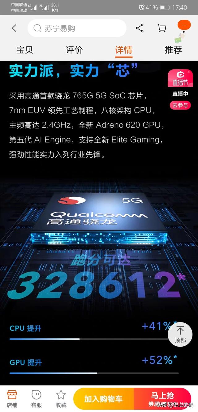VIVOZ6采用的是高通骁龙765G处理器,这款处理器是在骁龙765的基础上往游戏方面升级的处理器,可以说这是一款中端游戏处理器。他的跑分32万多,主频高达2.4GHz,所以这款手机玩王者,吃鸡这种游戏是毫无压力的。