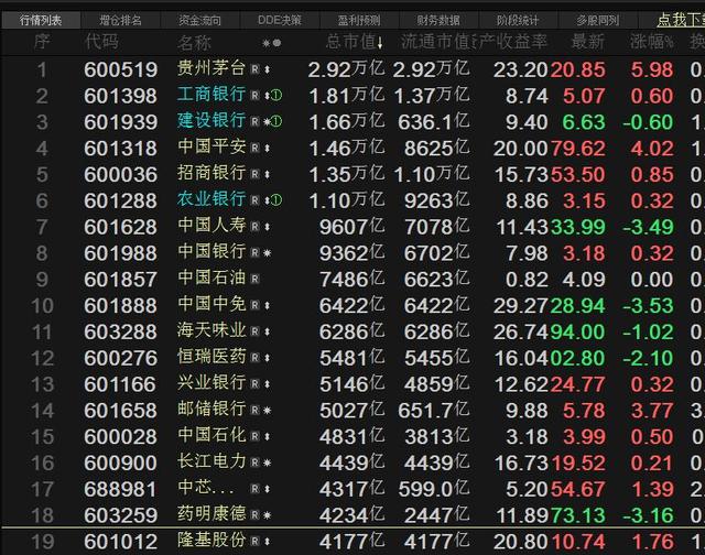 现在上证指数已经被以茅台所绑架。打开上证股票排行,按照总市值排序。茅台以2.92万亿排名第一,宇宙第一大行工商银行1.81万亿排名第二。由此可见,茅台在指数当中具有举足轻重的作用。所以,周四(2021-2-4)上证能够勉强停在3501点,茅台起到了很大的作用。