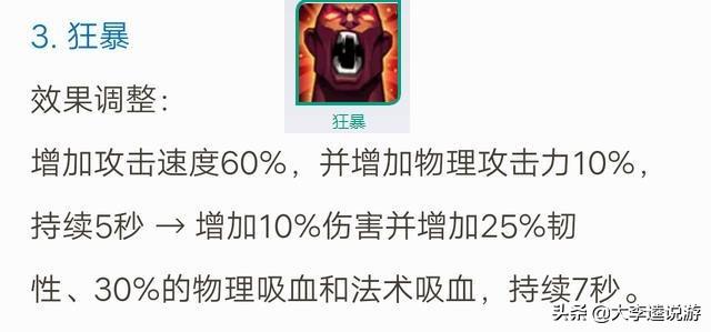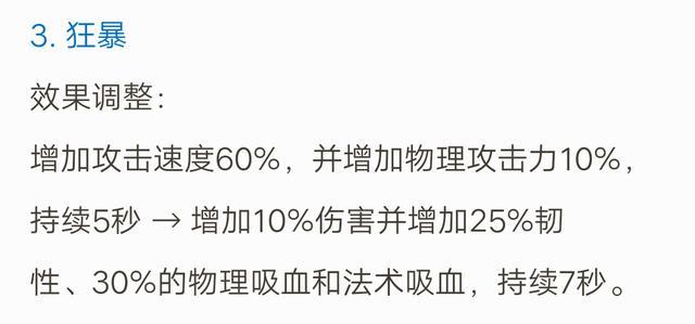 增加攻击速度60%,并增加物理攻击力10%,持续5秒 → 增加10%伤害并增加25%韧性、30%的物理吸血和法术吸血,持续7秒。