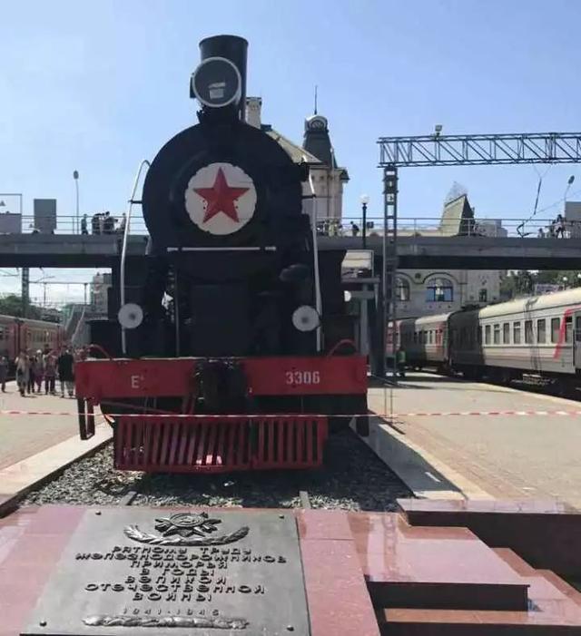 站台上,还有一台YEa型3306号蒸汽机车,是为纪念英勇的铁路工人。碑石雕刻的文字是:献给1941年至1945年卫国战争期间,英勇的远东铁路工人。