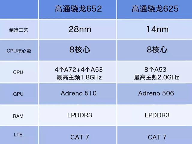 骁龙625采用的是更加先进的14nm工艺,而骁龙652采用的是28nm工艺,理论上625在功耗和发热控制方面会表现更优。