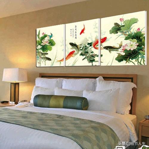 卧室是休息的地方,要舒适静谧,让人身心得到放松。鱼是睁着眼睛睡觉的,生活在水里终日游动,不适合挂在卧室。卧室挂画的色彩不宜过于艳丽,强烈的视觉刺激让人容易躁动,树木、植物、花类挂画比较适合挂在卧室,把大自然宁静祥和的氛围引入卧室,让心安静下来,有利于睡眠。