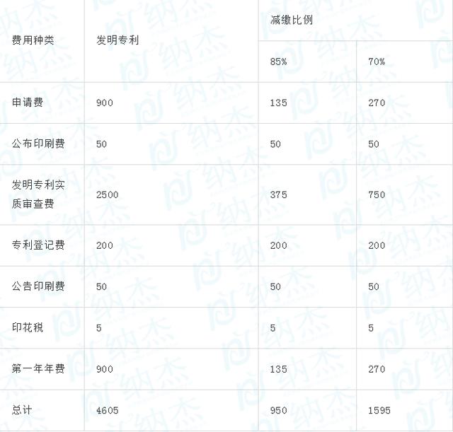 发明专利费用:申900+印50;实审费2500;复审费:1000;年费1-3年900,4-6年1200,7-9年2000,10-12年4000,13-15年6000,16-20年8000。