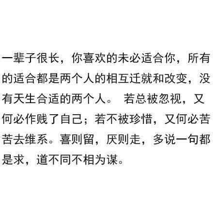 人只能活一次,为什么要将就呢?尤其是过日子,你要找一个知冷知热,会疼你的人。如果你找的是一个三观不同的人,整天为了鸡毛蒜皮的小事吵来吵去,或者天天无话可说,像陌生人一样,那你的人生过得有什么劲?