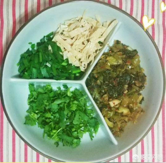 2)韭菜切段、腐皮用水发软后切丝下水烫熟,香菜、酸腌菜切成细段备用。