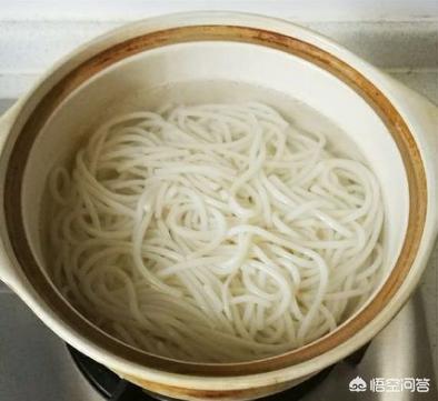 1)水煮沸后,将酸浆米线用清水沥过,下锅,用沸水烫一分钟。注意米线本身就滑软,别烫软烂了,一分钟就好。