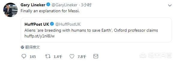 玩笑话,不过可以肯定梅西得到了全世界球迷的认可,作为世界上最出色的球员,梅西总是用表现征服球迷。莱茵克尔作为英格兰名宿,他在转发一条《赫芬顿邮报》的新闻,新闻写道:“有位牛津大学的教授声称,外星人正在与人类繁衍后代以拯救地球。”对此,莱因克尔转发并评论道:“终于能够解释梅西的存在了。”
