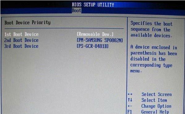 启动优先级设备选择(Boot Device Priority)在第一启动设备(1st Boot Device)里选择硬盘Hard Disk Drives(具体的要看硬盘的型号,例如图片里面应该选择PM—SAMSUNG SP0802////N)。