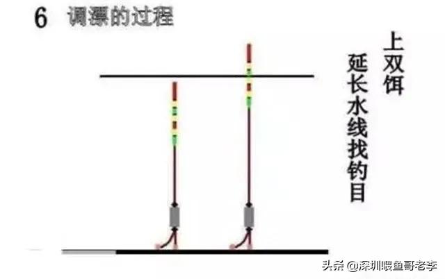 第五步,将浮漂调整到想要的目数。回到以上的操作,以空钩离底浮漂四目、加饵后剩两目为例,说明饵的重量是两目,那么你需要逐渐调整浮漂高度,调整到浮漂入水后露出两目以上,说明钩已到底,这时再往回调整到浮漂露出两目,这时双钩在水底的状态就是一钩平躺一钩轻触底。