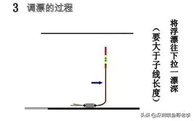 第三步:重新将浮漂向下挪动(子线长度+5公分)的距离,此时浮漂会再度沉入水中。