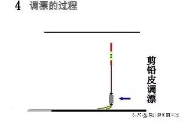 第三步,剪铅皮浮漂调整到想要的目数。因为上一步的操作,浮漂完全沉入水中,而且已知钩与浮漂间的距离小于水深,这时通过剪铅皮使浮漂浮出水面时,双钩是肯定离底的。