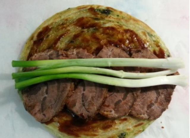 平底锅中抹薄薄一层油,把饼皮两面熟后盛出,卤上牛肉切块,切葱白。