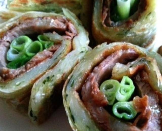 材料 中筋面粉150克,蔬菜油2汤匙(外加2茶匙),卤牛肉150克,切薄片,青葱5根,切段,生菜50克,切丝,小黄瓜(青瓜)100克,切细条,红甜椒100克,切条,黄甜椒100克,切条,甜面酱3汤匙,酱油2茶匙,糖2茶匙,麻油1/2汤匙 做法 1.钢盆内置面粉,倒入2汤匙蔬菜油和120毫升沸水,用筷子拌匀。取出揉成面团,静置15分钟。放在面板上揉成长条状,切成8份,每份成圆形薄面饼。 2.取一中碗,倒入甜面酱、酱油、糖、麻油,用3汤匙冷开水拌匀。 3.锅内下剩余的2茶匙蔬菜油,加热。入酱料炒香,调制成面酱。取一平底锅,加热。面饼皮烙熟。 4.食用时摊开面饼,涂抹调好的面酱,依次摆放牛肉片及葱、生菜、小黄瓜、甜椒等蔬菜,卷成饼状即可。