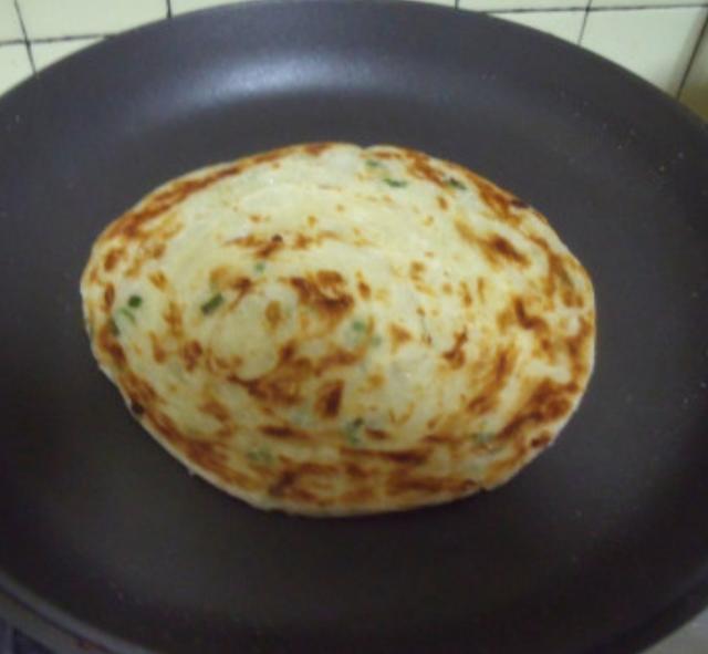 平底锅或饼铛烧热,锅里不放油、不放油、不放油。把饼快速低一点一手拿起倒到另一只手上,然后稳准狠地“bia”在锅里中间(这似乎是一个技术活啊),如果放歪了稍等两秒钟轻轻调整一下,盖锅盖 看到饼皮在手上摊下去的软硬厚薄程度了吧?一秒拍照再等一下就废了