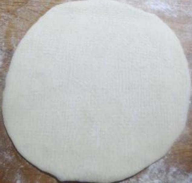 面杖擀开,大约直径两个手掌宽的薄饼,我的手小约20公分的样子吧