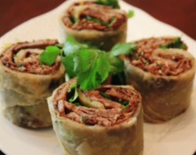 【牛肉卷饼】原料:牛肉800克,八角,桂皮,草果,甘草,山楂,香叶,干红椒,小茴香,肉蔻各适量,葱姜,料酒,酱油,冰糖盐各适量。〖做法〗将牛肉切块洗净后整块焯水,取大锅放足水下入卤料包,加入葱姜,料酒,酱油,冰糖,盐,大火烧开,将煮开的卤水和牛肉放入压力锅中卤30分钟,关火后自然凉透,牛肉浸泡在卤水中。