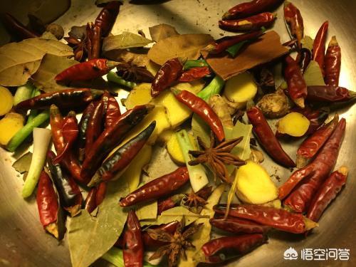 6、锅中加入菜籽油,(菜籽油最佳)依次放入干辣椒段,灯头椒,麻椒,花椒,八角,香叶,大料,丁香,桂皮,肉蔻炒出香味。