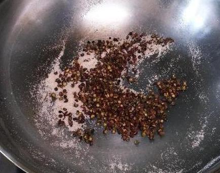 第一步:起锅将锅中的水烧干之后关小火,不放油,直接倒入花椒煸炒出香味后盛出来。