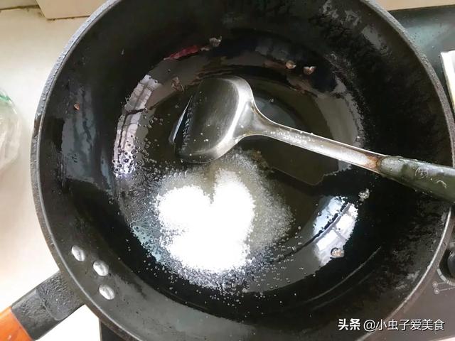 2、锅中倒油,放一勺白糖,小火使白糖融化,要搅拌一下,小心糊了。