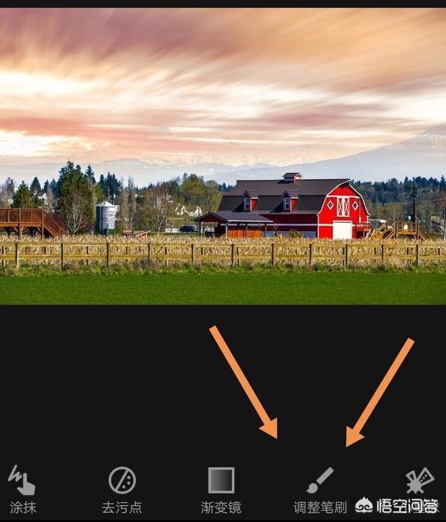调节笔刷大小、硬度及不透明度后,对房屋进行涂抹,可以放房屋、栅栏等照片局部更清晰。