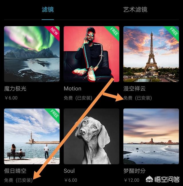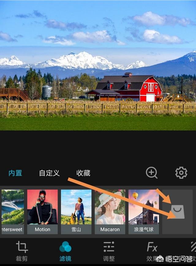 2、点击图片下方的滤镜,把页面下方小图,向后翻找,找到最后的文件件,打开。在滤镜了里面找到:漫空祥云、假日晴空、浪漫气球,下载安装到手机上。