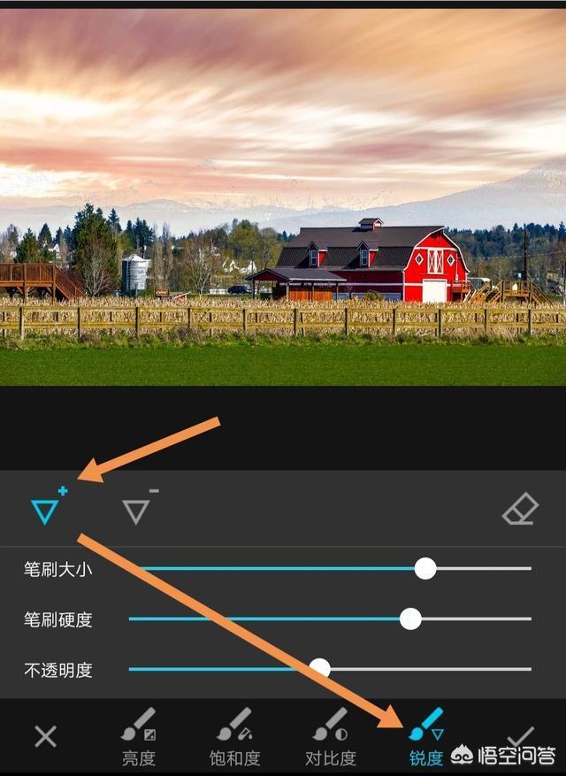 5、点击右上角三个点,选择局部修整,再点击调整笔刷,选择锐度笔刷。