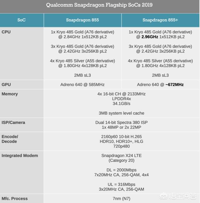目前性能不错的安卓手机,那我们直接选择855处理器的手机就可以啦!因为高通855处理器是目前最强的安卓端处理器,不过话又说了回来,855处理器的性能都是一样的,本质上没有性能好坏之分,但是最近高通发布了855处理器plus版本,相对来说主频提升到了2.96GHZ,而现在搭载的855处理器主频为2.84GHZ,而且在GPU方面plus版本的频率也有增加,如下图所示就是两者的区别: