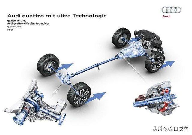 很多分时四驱采用的是纯机械的牙嵌式差速锁进行动力传递,相对而言,这种纯机械的四驱结构传递效率相对更高一些,而著名的奥迪Quattro四驱系统采用的托森差速器,其本质上采用的是涡轮和涡杆进行动力传递,传递效率相对低一些。一些采用多片离合器结构的四驱车型,由于在动力传递过程中会产生一定的滑动摩擦,这样也会导致一定动力的损失。