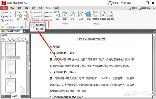 2、然后,点击操作界面上方工具栏中的“页面组织”-”拆分“-“拆分文档”。