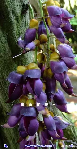 配图显示出:常春油麻藤,其总状花序生于老茎,花大,下垂;花萼密被绒毛,花冠深紫色或紫红色;下垂花序上的花朵,盛开时形如成串的小雀,又称之为“小禾雀”。