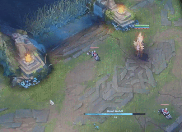 这个大招非常的炫酷,显示蓄力飞起然后一阵狂袭勇下,非常像DNF里的女柔道。这一技能有点行星撞击的感觉。看击打在小兵身上好像没有击退和击飞的效果,不过伤害肯定是非常高的。相信潘森重做归来后一定是一个非常OP的英雄