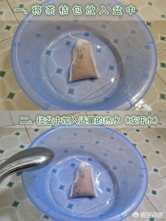 ② 往盆里面倒热水浸泡茶麸包,水量没过头就可以。