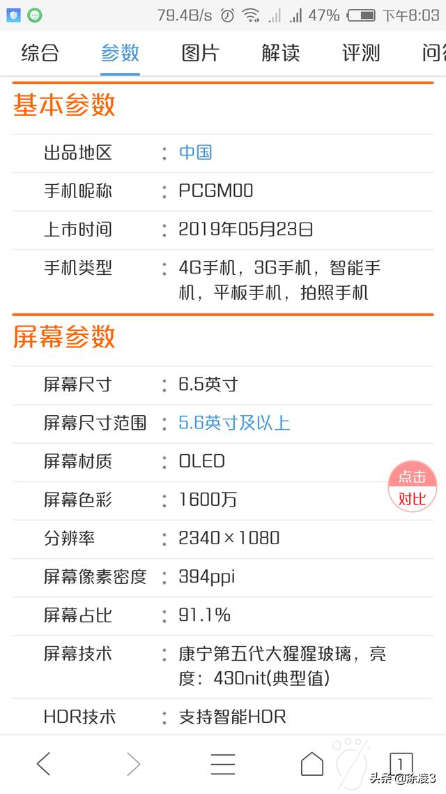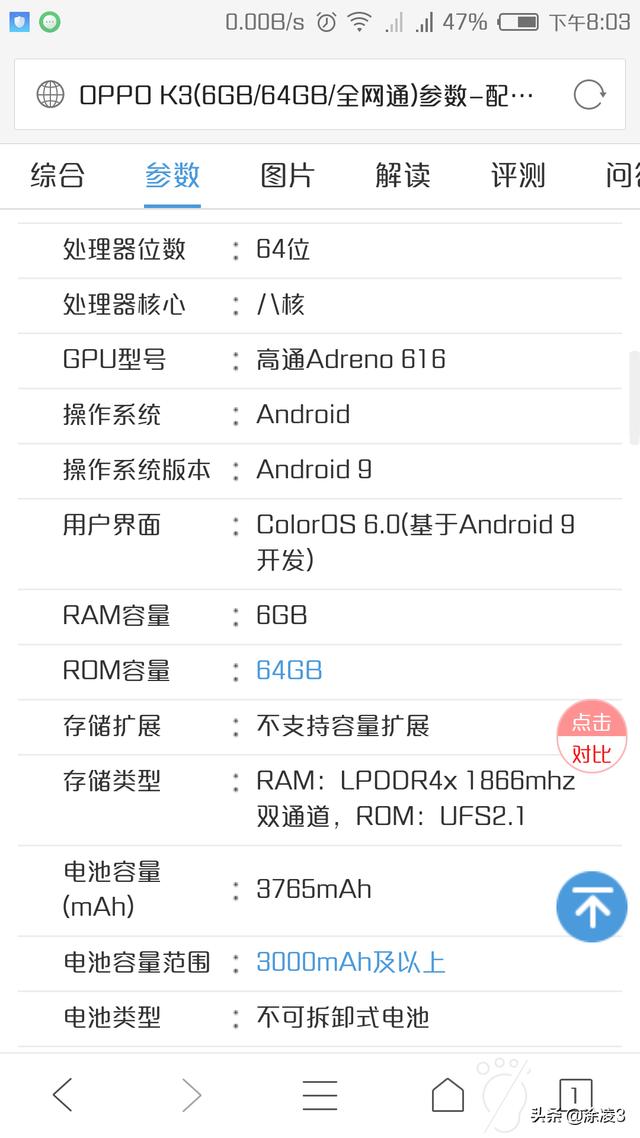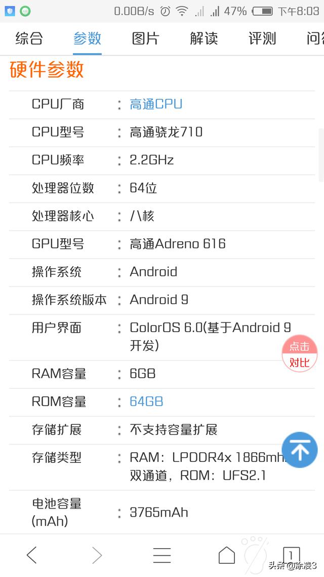 3. 6+64G的内存,基本是安卓标配了,电池3765mAh,电池偏小,6.5的屛,屏幕亮起来会很费电。