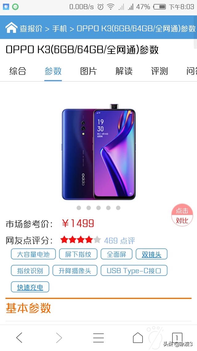 根据微博数码博主@数码闲聊站 曝光的信息来看,OPPO K3很有可能是Reno标准版的“简配版”,采用了相似的设计思路,例如升降前置摄像头和真全面屏方案。