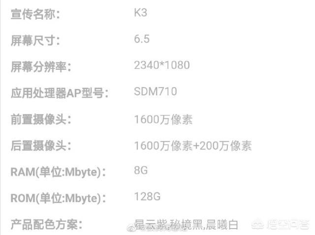 配置图显示,OPPO K3拥有6.5英寸FHD+级别屏幕,搭载高通骁龙710移动平台,辅以8+128GB存储,前置1600万像素摄像头,后置1600万+200万像素摄像头,提供星云紫、秘境黑、晨曦白三款配色。
