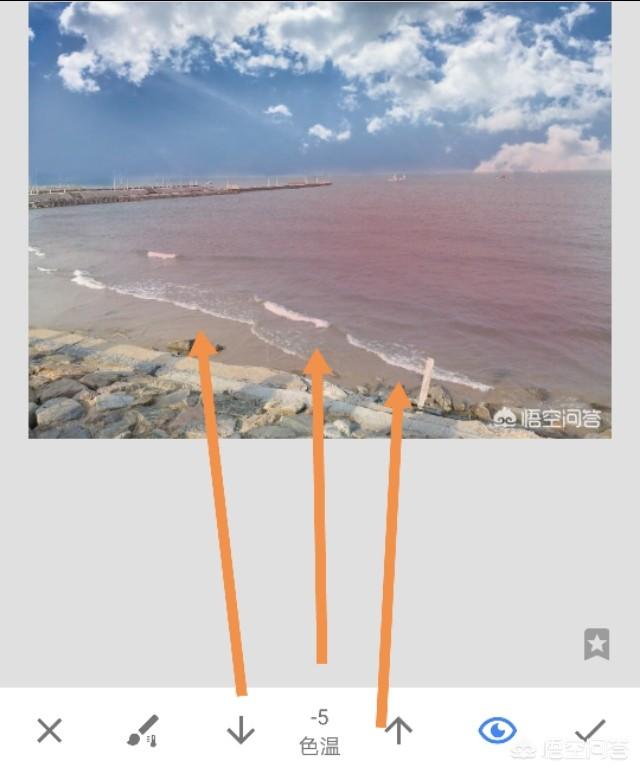 换天,并不是把天换完就成了,这么简单。比如例图,天下面是海,天是蓝的,海应该也是蓝的。用工具,画笔,色温画笔,调到负值,对海进行涂抹。哦了!