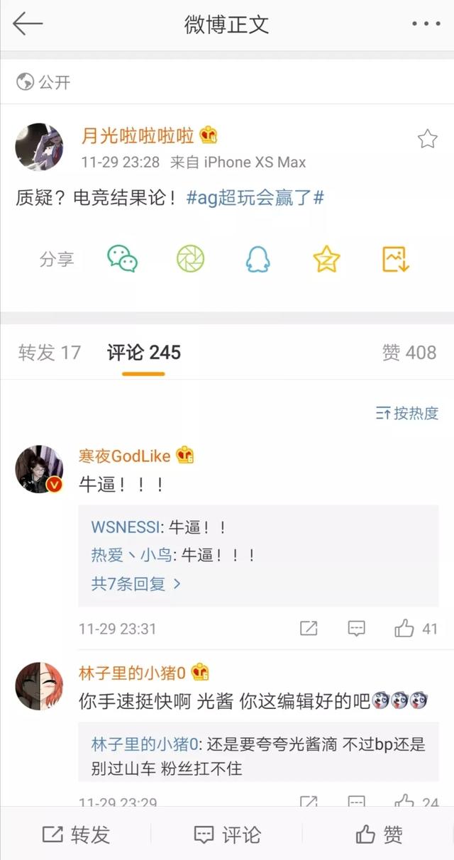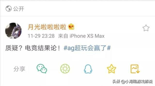 而AG超玩会主教练月光也在赛后第一时间发了一篇微博,微博仅有7个字,那就是:质疑?电竞结果论!大家都之前月光之前曾经立下FLAG:KPL秋季赛和冬冠杀入决赛并至少拿一个冠军,否则从此无月光。在那之后月光也遭受了无数玩家的质疑,然而就在29号晚上,他再次证明了自己。从这篇微博中也能看出他心理憋着一口气。