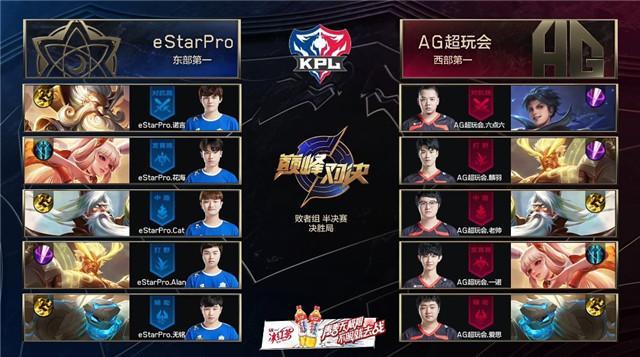 为了晋级败者组决赛这两支战队必须背水一战。前六局比赛中双方可谓精锐尽出,AG超玩会在本场比赛中更是多次进行人员轮换。第一局比赛eStarPro便拿出貂蝉刘邦的全新体系打法,虽然前期被频繁反蓝,但还是通过后期对于团战的精细处理成功翻盘。