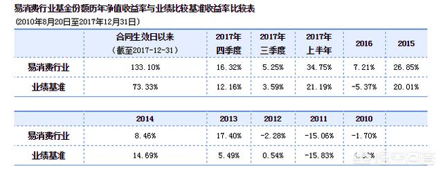 比如易方达消费行业股票型证券投资基金,其业绩比较基准是:中证内地消费主题指数收益率×85%+中债总指数收益率×15%,也就是说评判这只基金业绩好坏,就要看它能不能跑赢这个比较基准,从这个表里来看,2010年、2012年、2014年这个基金都是跑输的,在2013年以及2017年明显跑赢。业绩基准是机构的目标,它只有按照基准的成分股构成做类似组合,追涨杀跌才能在上涨的时候净值上涨,在下跌的时候净值回撤。