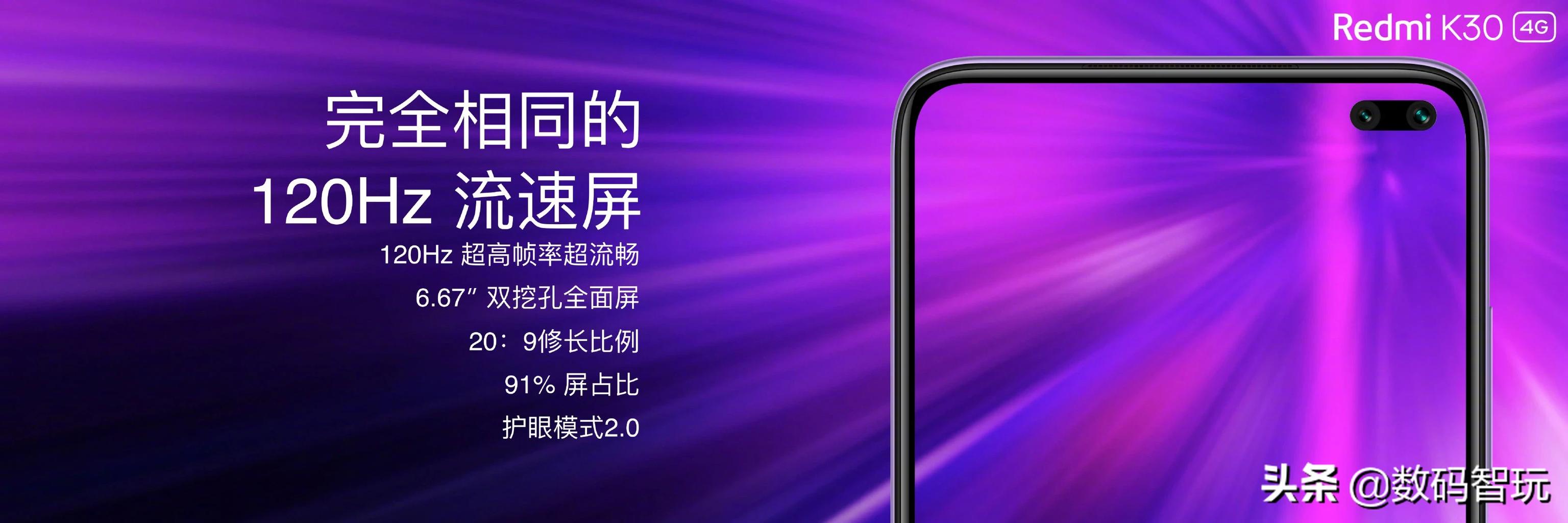 红米K30 分为4G版本和5G版本其中4G版本采用骁龙730G处理器,5G版本采用骁龙765G处理器;但是由于产能问题红米K30 5G版本要在1月份发售,所以目前只有4G版本。在红米K30发布会上卢总坦言到“在红米K20上面去掉红外遥控以后,遭到很多的嫌弃,所以在红米K30上面又重新增加红外遥控。”