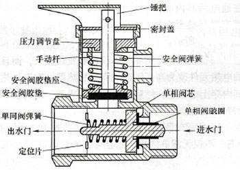 - 安全阀由阀座、阀芯和加载机构三大部分组成。阀体三通,内部分为进水腔、出水腔和安全腔;安全腔开有排水口,在出水腔里放置逆止阀芯、外调节弹簧、用调节限位片限定,在安全腔里放置弹性垫、安全阀芯及排水杆、安全压力调节弹簧,调节盖穿过排水杆拧入安全腔、外有保护盖板,在排水杆端头接有排水耳,排水耳用保护扣扣住,保护扣用排水管接头固定在排水孔座上。它具有逆止回流、安全泄压、排水清洗等功能,且调节方便。安全阀应垂直安装,并装设在容器或管道气相界面位置上。