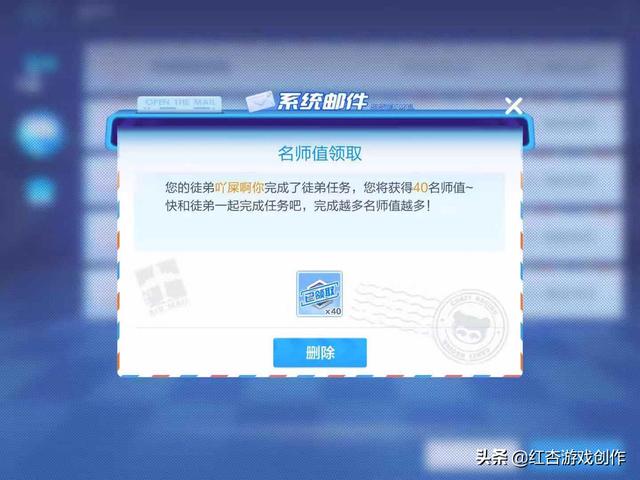 师父任务完成了之后呢,我们就需要带徒弟完成徒弟任务,徒弟每完成一个徒弟任务任务,师傅都可以获得名师值,徒弟任务总共有6个,每个任务分三个完成条件,徒弟完成一个师傅获得一个任务的名师值奖励,通过邮件发放。