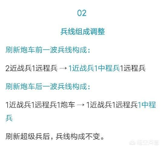 首先兵线组成调整由之前的2个近战兵加1个远程兵变成了1个近战兵1个中程兵1个远程兵,当刷新炮车后兵线由1近战兵1远程兵1个炮车变成1个近战兵1个远程兵1个中程兵,刷新超级兵时兵线组成不变!其次本次调整也将兵线的强度进行了调整,本次调整拉近了中路小兵的间隙,在保证中路职业的清兵效率的同时,也帮助召唤师们节约出时间进行边路游走,更好的带起前期节奏。